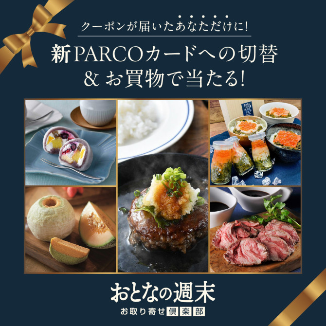 期間中、PARCOカード[JFRカード㈱発行]に新規ご入会いただき、お買物いただいたお客様の中から抽選で650名様に、グルメ雑誌「おとなの週末」の公式通販サイト「おとなの週末 お取り寄せ倶楽部」からセレクトしたグルメ・スイーツが当たる抽選会にご招待いたします。
